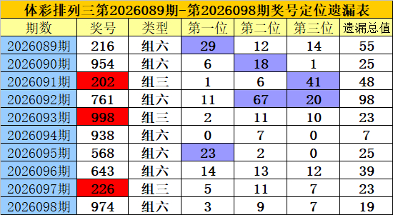 开奖回顾:排列三第2026098期奖号为:974,各位号码遗漏值分别为3、9、7,遗漏总值为19。